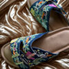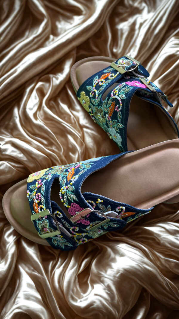 Add a burst of colour and handcrafted charm to your everyday look with Gulrang — our latest buckled sliders designed to stand out effortlessly. Made on a vibrant blue denim base, these sliders are adorned with intricate multicolour beadwork, shimmering sippi embroidery, and finished with a bold, statement metal buckle for that extra edge.