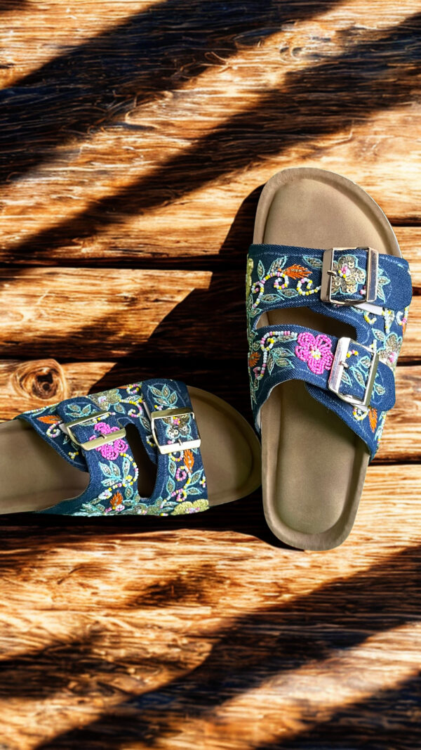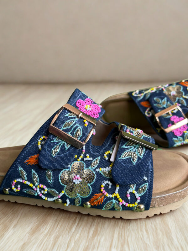 Gulrang – Embroidered Buckled Sliders in Blue Denim