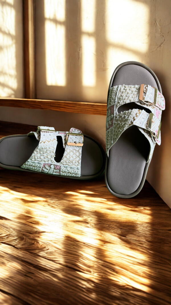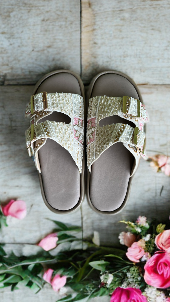 Hand-Embroidered Upper: A premium, pastel-toned leather base is lovingly adorned with delicate white pearls, soft pink and white beads, and subtly placed stones for a gentle shimmer.